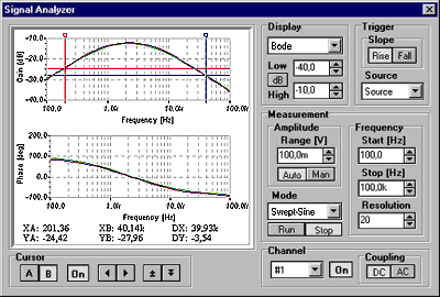 قم بقياس الإستجابة الترددية لدارتك في الزمن الحقيقي .مولد التوابع في TINALab سوف يقوم بتوليد موجة مسح جيبية حقيقية ، إلتقط الإستجابة ثم قم بعرضها على محلل الإشارة حيث سيكون بالإمكان مقارنتها مع القياسات الإفتراضية ( المحاكاة ) .